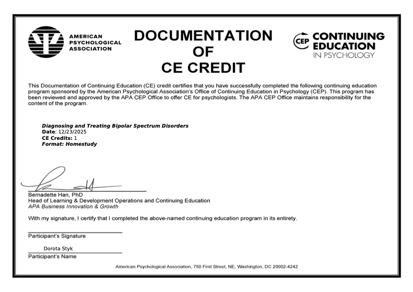Certifications: 246 CPD, CME and CE courses in Psychology, Neuroscience and Research Methods accredited by: American Psychological Association (APA), Oxford University, The Stanford University School of Medicine, Yale University, King’s College London, among others.