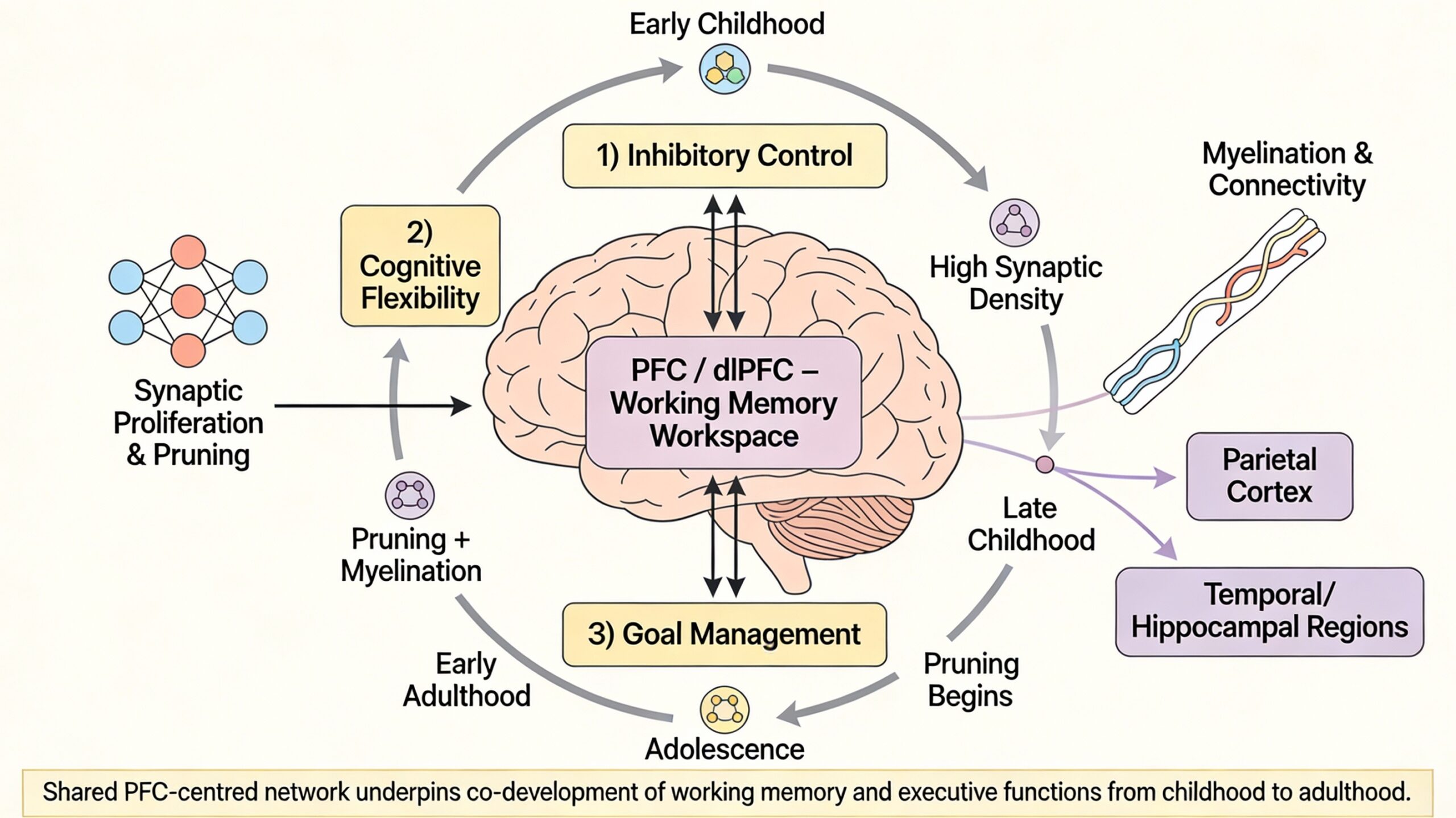 The PFC is one of the last brain regions to reach full structural maturity, characterised by two simultaneous, complementary biological processes: synaptic proliferation and pruning, and increased white matter myelination. During early childhood, the PFC exhibits an overabundance of synaptic connections, a state of exuberant connectivity that provides the neural substrate for immense learning potential (Huttenlocher & Dabholkar, 1997). However, cognitive efficiency at this stage is low due to “neural noise” and poor signal differentiation. From late childhood through adolescence, experience guides a protracted process of synaptic pruning, where frequently used connections are strengthened and unused ones are eliminated, leading to more refined and efficient neural circuits (Tau & Peterson, 2010). Concurrently, there is a significant increase in myelination within the PFC and along the major fibre tracts connecting it to other regions, such as the superior longitudinal fasciculus linking frontal and parietal cortices. This myelination, which continues into the third decade of life, enhances the speed and reliability of neural transmission, allowing for faster integration of information across distributed networks (Lebel, Treit, & Beaulieu, 2019). This dual process of pruning and myelination fundamentally refines the brain’s hardware, transforming a diffuse, noisy network into a streamlined and efficient one.