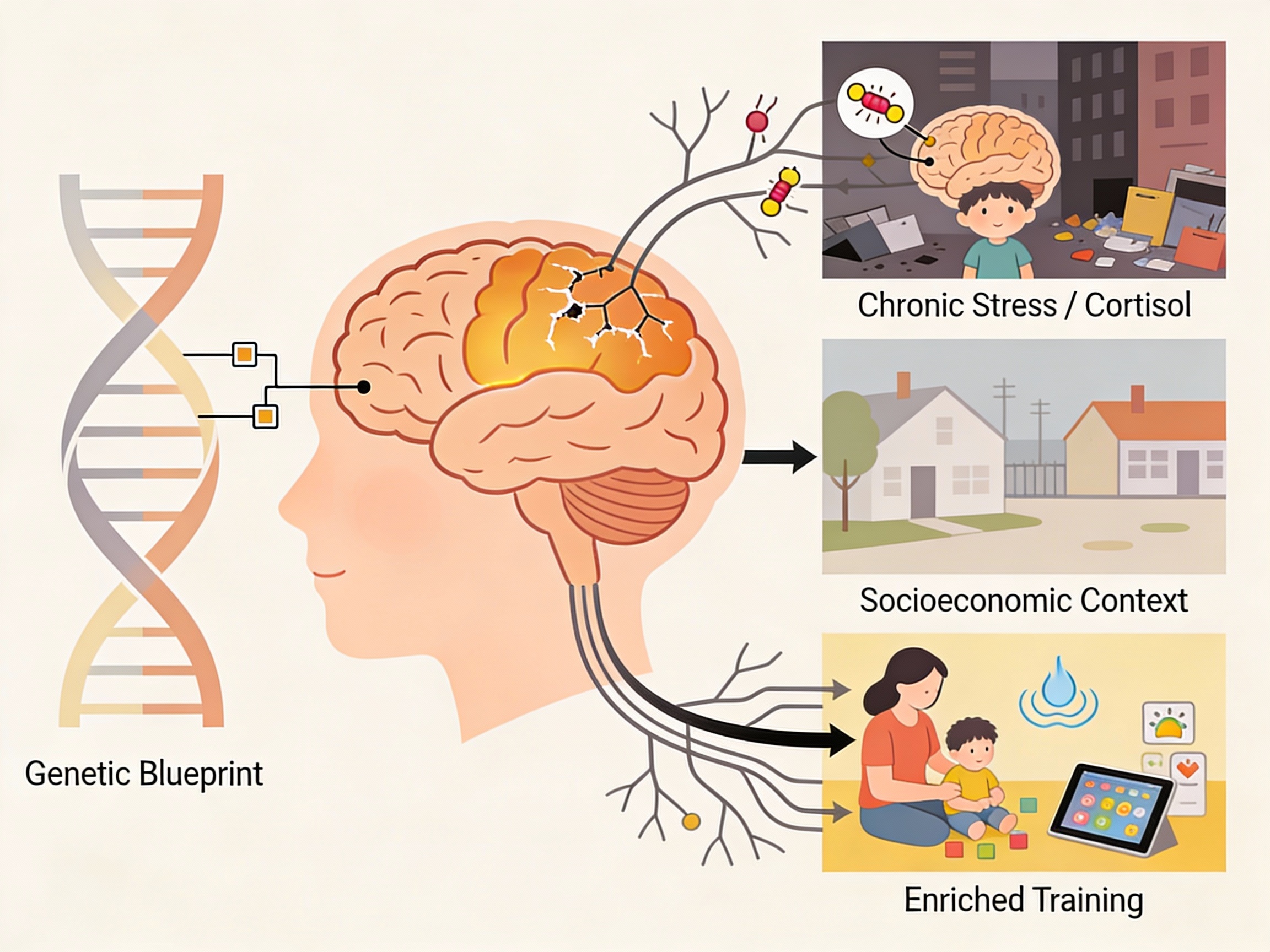 This neural maturation is not a predetermined, isolated process. It is profoundly shaped by a dynamic and continuous interplay between genetic blueprint and environmental experience. Quantitative genetic studies indicate a substantial heritable component to the structure and function of PFC circuits, with genetic factors accounting for a significant portion of individual differences in working memory performance (Friedman et al., 2008). However, this genetic expression is modulated by experience. For example, chronic stress and socioeconomic disadvantage are associated with altered prefrontal development and poorer executive function outcomes. The mechanism is believed to involve the dysregulation of stress hormones like cortisol, which, in high and chronic levels, can impair PFC synaptic architecture and function, particularly in the highly plastic period of childhood (Lupien, McEwen, Gunnar, & Heim, 2009). Conversely, enriched environments, responsive, scaffolded caregiving, and targeted cognitive training can foster stronger executive skills. Interventions such as those involving structured play, mindfulness, or computerised training are thought to work by providing repeated, graded challenges to the PFC system, thereby promoting healthy synaptic strengthening, pruning, and network specialisation (Diamond & Lee, 2011). This evidence underscores that the developing PFC is an “experience-expectant” organ, designed to be sculpted by interaction with the world.